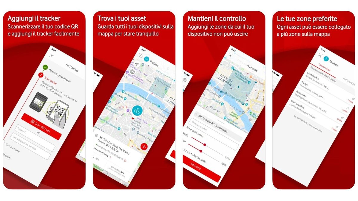 Sensori di movimento integrati Vodafone Business Tag & Track viene offerto come servizio end-to-end.